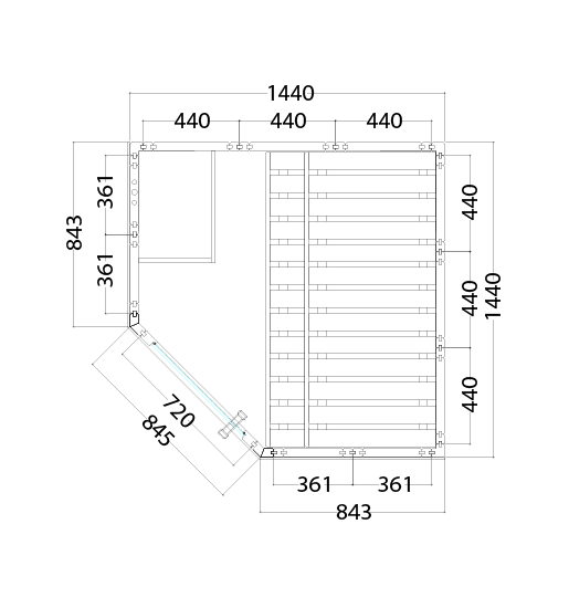 - Cabinegrootte: 1450 x 1450 x 2040 mm
